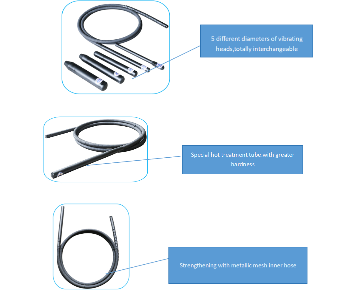 1. Fünf austauschbare Vibrationsköpfe in verschiedenen Durchmessern sind erhältlich. Flexible Wellen und Vibrationsköpfe lassen sich schnell und einfach austauschen, sodass sich die Bediener mit minimalen Ausfallzeiten an unterschiedliche Arbeitsanforderungen anpassen können.
